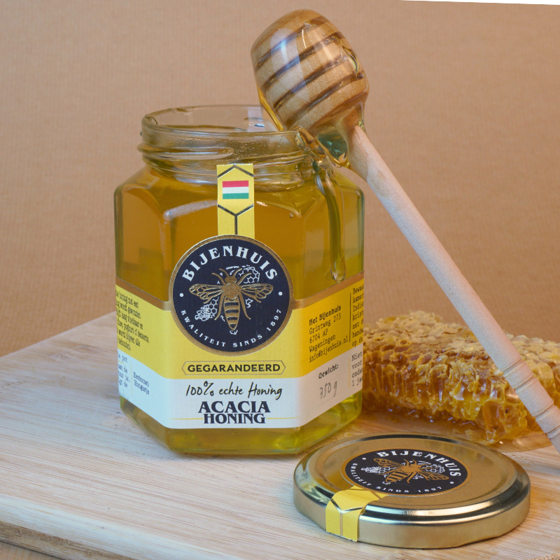 De acaciahoning in deze potten komen van onze geselecteerde imkers uit Hongarije.