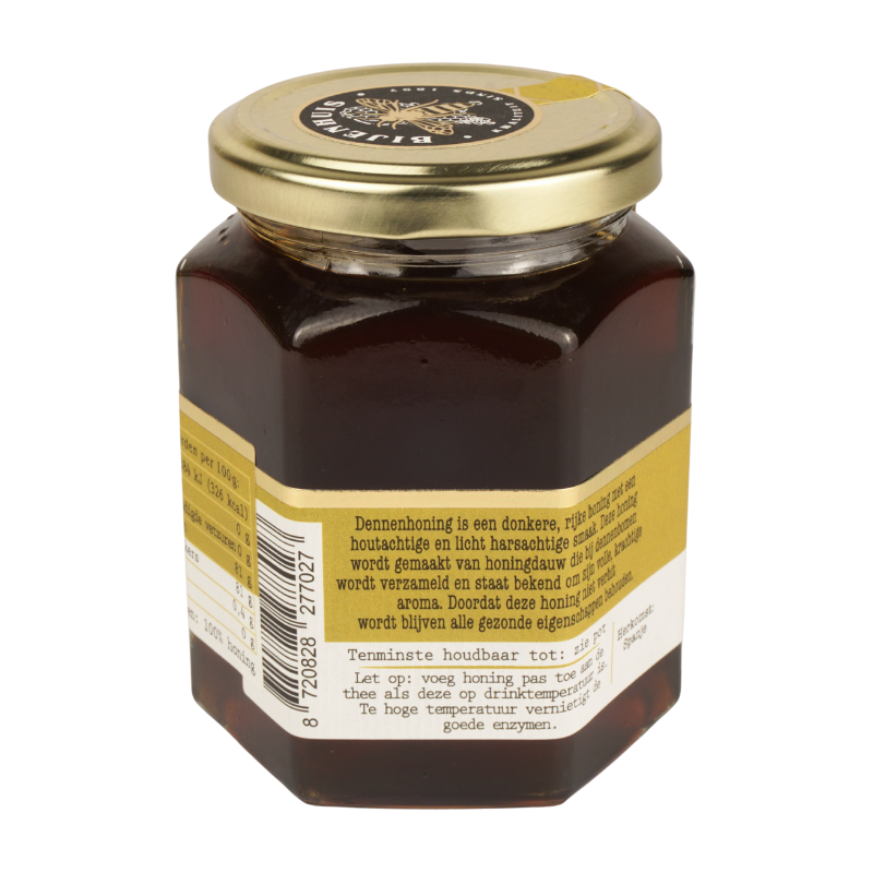 Dennenhoning is een amberkleurige en kruidige honing. Deze bijzondere honing wordt door de bijen gemaakt met honingdauw in plaats van nectar. Honingdauw is een zoetige stof die wordt uitgescheiden door bladluizen. De bijen verzamelen dit en zetten het om in honing. Dennenhoning is een zeer mineraal- en vitaminerijke honing.