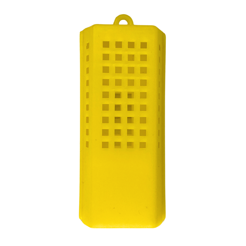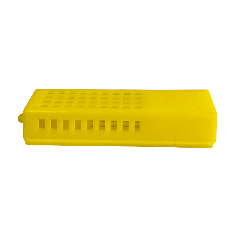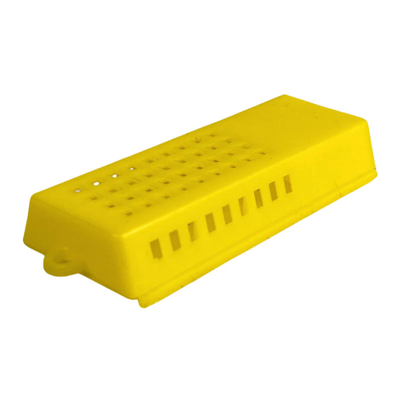 Dit kooitje heeft ruimte voor suikerdeeg en jonge bijen, om de koningin gedurende haar transport te verzorgen.