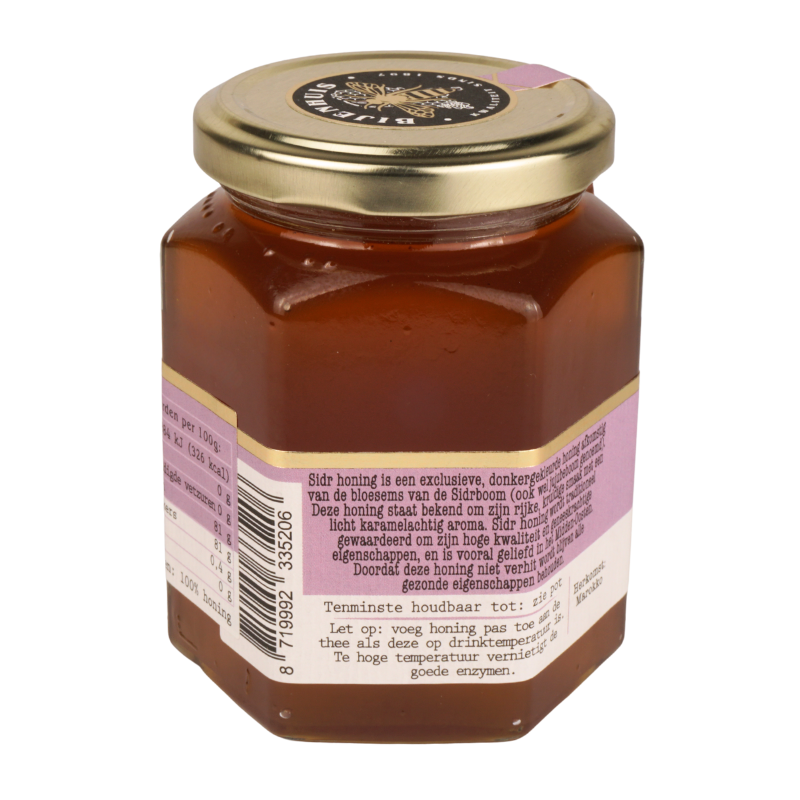 Sidr (lotusbloesem) honing is een premium honingsoort die wordt geproduceerd door bijen die zich voornamelijk voeden met de nectar van de Sidr-boom, die inheems is in verschillende regio's in het Midden-Oosten, Jemen en delen van India. Sidr-honing staat bekend om zijn kenmerkende smaak, rijke aroma en talrijke gezondheidsvoordelen. Het wordt vaak beschouwd als een van de meest luxueuze en medicinale honingsoorten vanwege het hoge gehalte aan voedingsstoffen en antioxiderende eigenschappen.